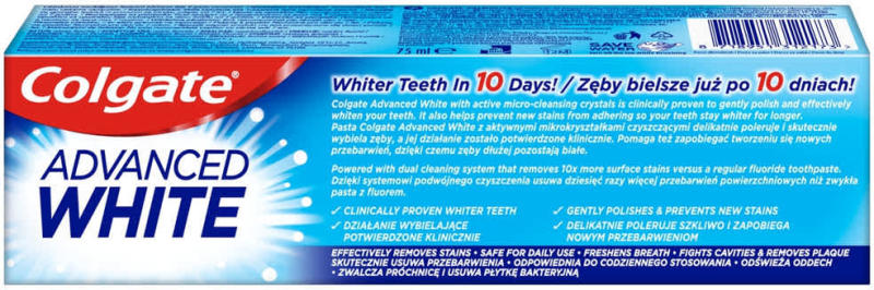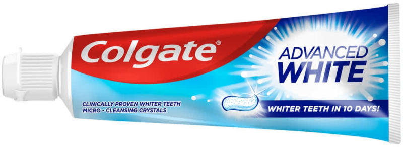 Tiszta, fehérebb fogak már 10 nap alatt! A Colgate Advanced Whitening fogfehérítő fogkrém mikrokristályokat tartalmaz, melyek finoman polírozzák fogaid, ezzel elősegítve, hogy fogaid újra elnyerjék természetes fehérségüket. Tisztítás közben eltávolítja a fogak elszíneződését és megakadályozza az újabb elszíneződések kialakulását.