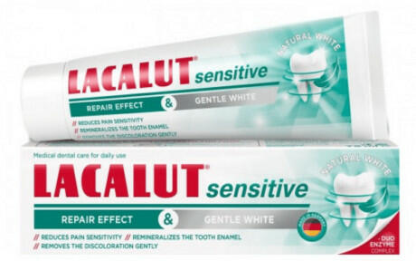 VÉDELEM AZ ÉRZÉKENY FOGAK ÉS A FOGÍNY SZÁMÁRA TERMÉSZETES FEHÉRSÉG + DUO-ENZIM-KOMPLEX Csökkenti a fájdalomérzékenységet. Remineralizálja a fogzománcot. Gyengéden távolítja el az elszíneződéseket. A Lacalut védőformula argininnel védi a fájdalomérzékeny fogakat a külső behatások ellen. Csökkenti a fájdalomérzékenységet, főleg a fognyakak területén. Segít a fogak természetes fehérségét helyreállítani, miközben kíméletes a fogínyhez és a fogakhoz. A hidroxiapatit (a fogzománc fő összetevője) támogatja a fogfelszín remineralizációját (az ásványi anyagok beépülését a fogzománcba). A fogak simábbak és ellenállóbbak lesznek. Alkalmazás: Reggel és este mossa meg fogait borsónyi mennyiségű fogkrémmel. Csak felnőttek számára ajánlott. Nátrium-fluoridot tartalmaz (1.350 ppm fluorid). Összetétel: Aqua, Hydrogenated Starch Hydrolysate, Hydrated Silica, Hydroxyapatite, Potassium Chloride, PEG-32, Sodium Lauryl Sulfate, Arginine, Poloxamer 188, Aroma, Disodium Pyrophosphate, Cellulose Gum, Sodium Myristyl Sulfate, Triacetin, Sodium Fluoride, Sodium Saccharin, Sodium Cetyl Sulfate, O-Cymen-5-Ol, Lactose, Bromelain, Maltodextrin, Papain, Limonene, CI 77891.